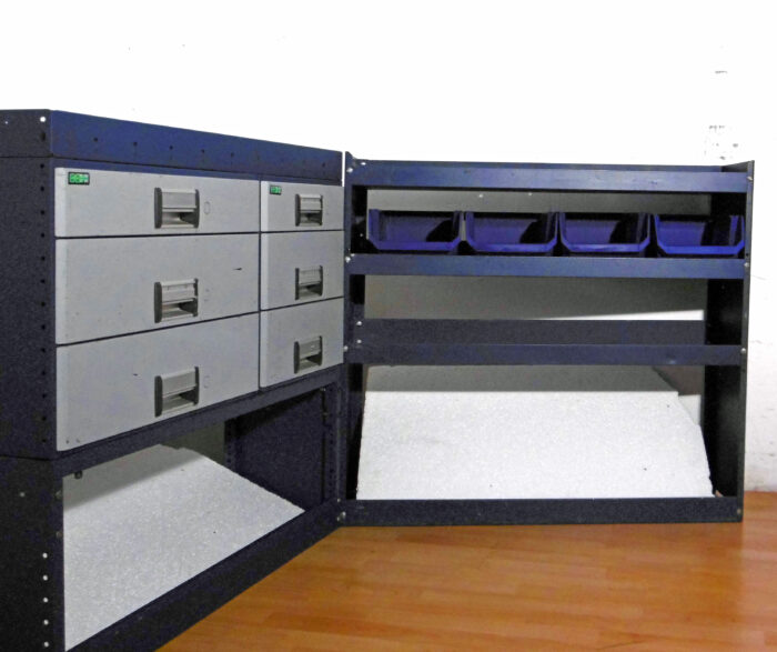 - Bild 1 (linke Seite): 6 x Schübe, Regal, oben Ablage, unten offen