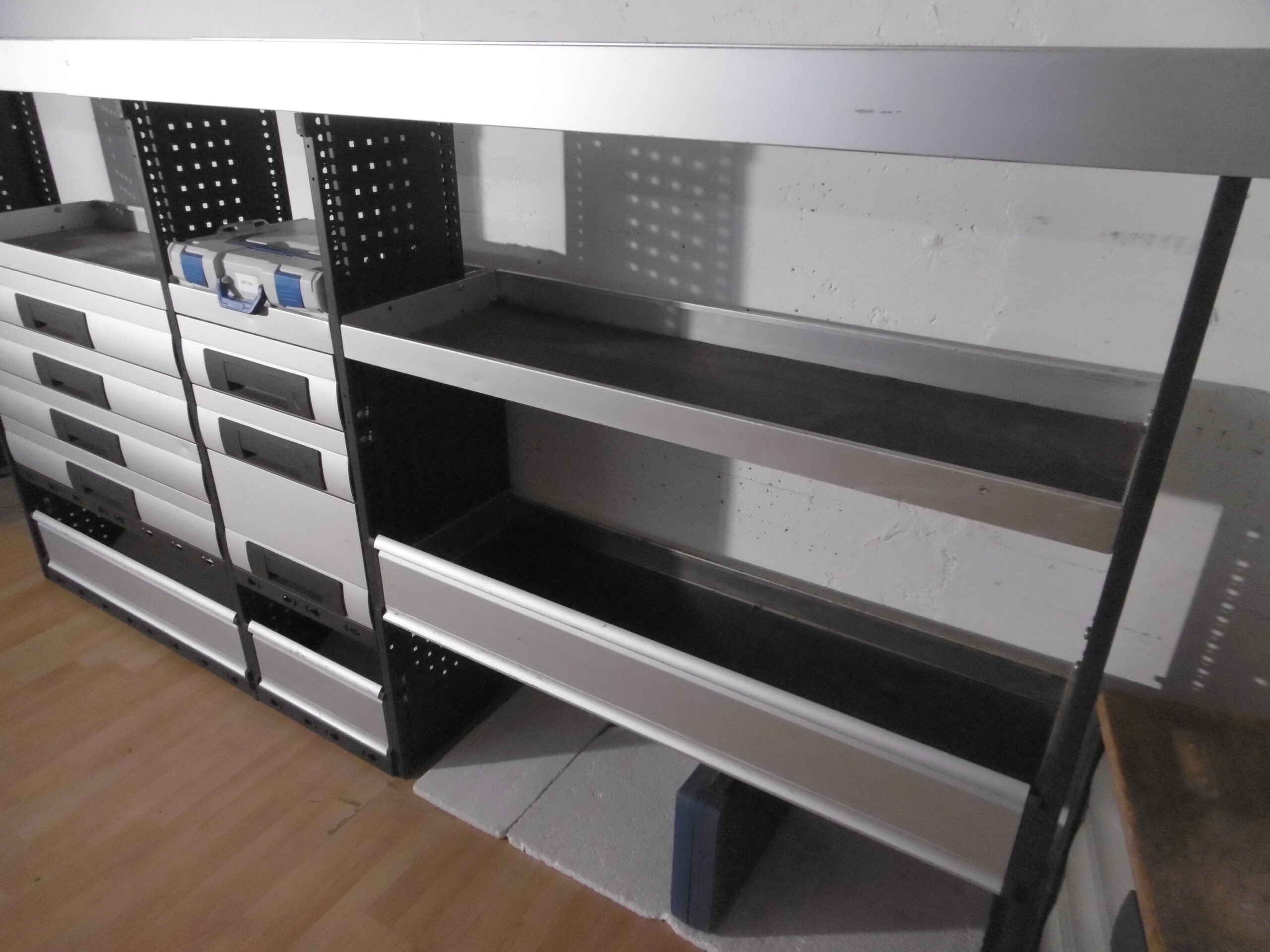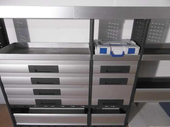 - Bild 1 (linke Seite): 7 x Schübe, oben Wanne, 1 x L-Boxx Koffer, div. Ablagen auch mit Klappe, div. Sortierboxen, unten Klappen/ offen
