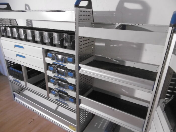 - Bild 1 (linke Seite): 2 x Schübe, 4 x neue T-Boxx Koffer, 1 x mobil Koffer, div. Ablagen auch mit Klappen, div. Sortierboxen, unten Klappe/ offen