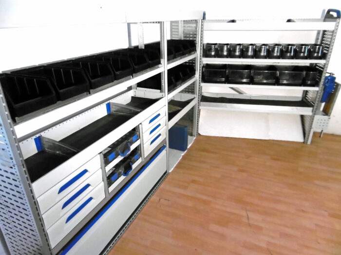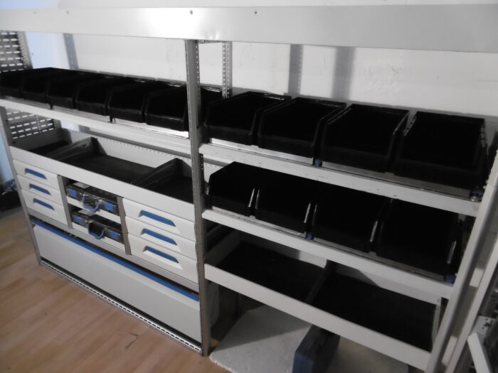- Bild 1 (linke Seite): 6 x Schübe, 2 x neue T-Boxx Koffer, oben Wanne, div. Ablagen, div. Sortierboxen/Trennbleche, unten Klappe/ offen