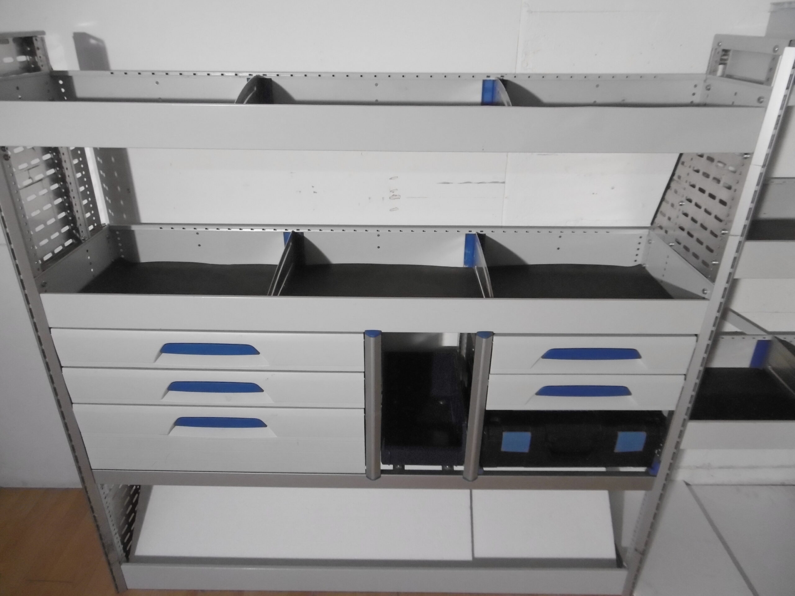 - Bild 1 (linke Seite): 5 x Schübe, 1 x L-Boxx Koffer, div. Ablagen, div. Sortierboxen/ Trennbleche, unten offen