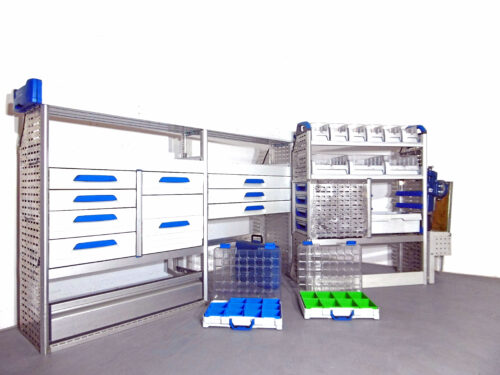 - Bild 1 (linke Seite): Regal, div. Sortierboxen, unten offen