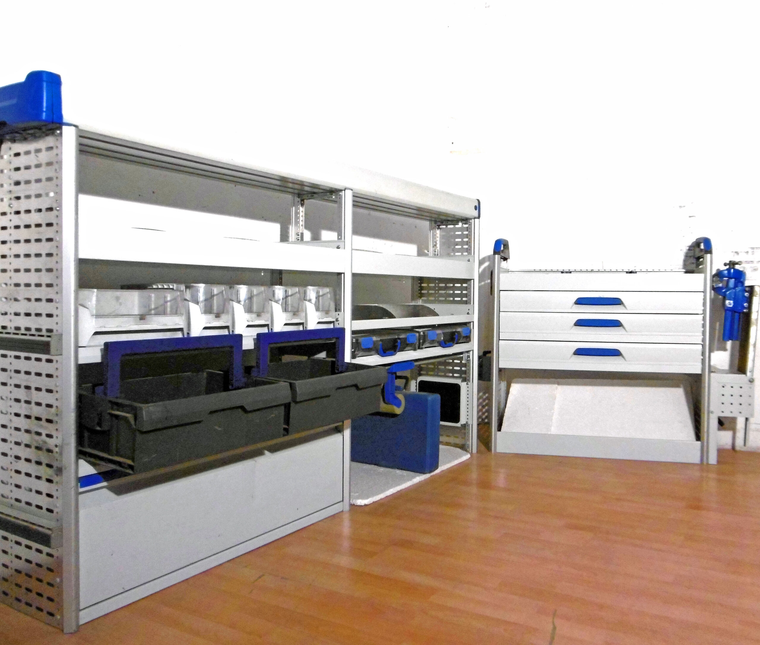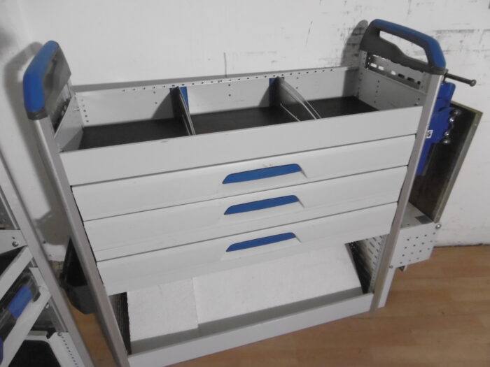 - Bild 1 (linke Seite): 2 x Mobil Koffer, 2 x neue T-Boxx Koffer, oben Wanne, div. Ablagen, div. Sortierboxen/ Trennbleche, unten Klappe/ Kofferfixierung
