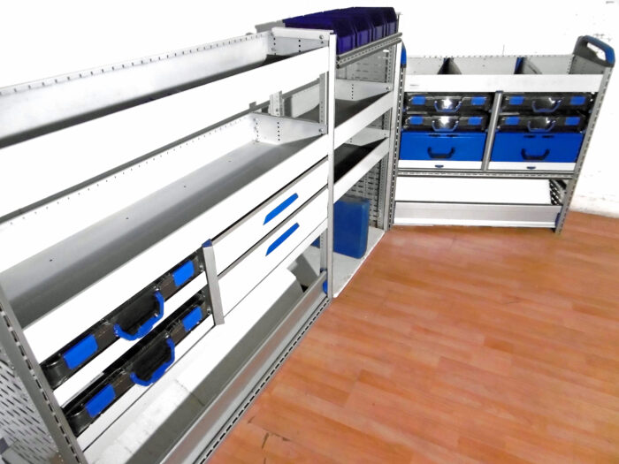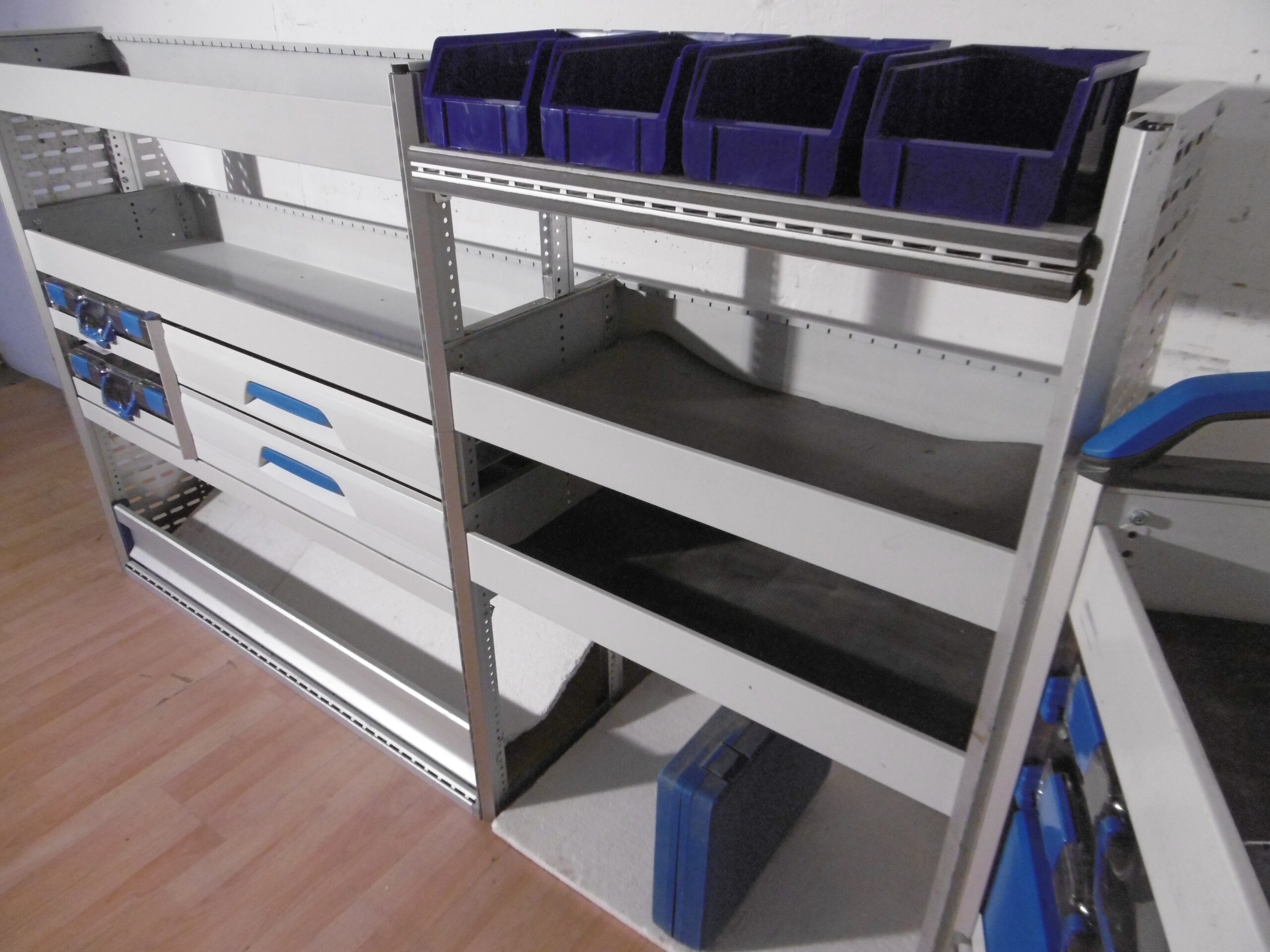 - Bild 1 (linke Seite): 2 x Schübe, 2 neue T-Boxx Koffer, div. Ablagen, div. Sortierboxen/Trennbleche, unten Klappe/ offen