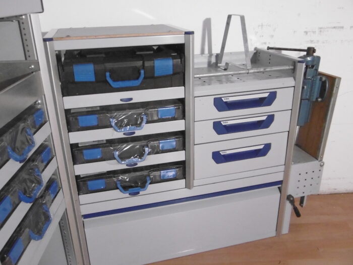 - Bild 1 (rechte Seite): 3 x Schübe, 3 x neue T-Boxx Koffer, 1 x L-Boxx Koffer, herunterklappbare Werkbank mit Schraubstock, Ablage, unten Klappe
