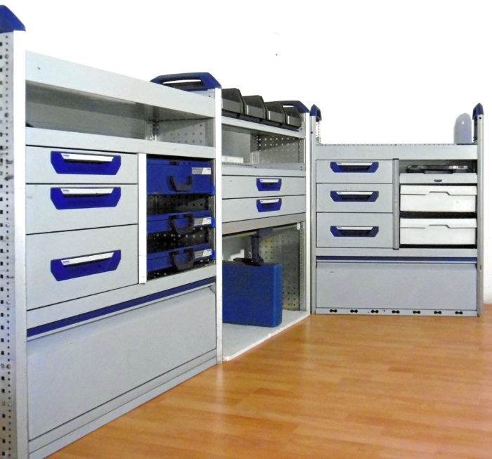 - Bild 1 (rechte Seite): 3 x Schübe, 1 x Sortimo i-Boxx Koffer, 2 x Mobil Koffer, oben Ablage, div. Trennbleche, unten Klappe